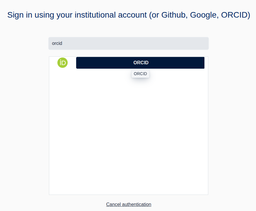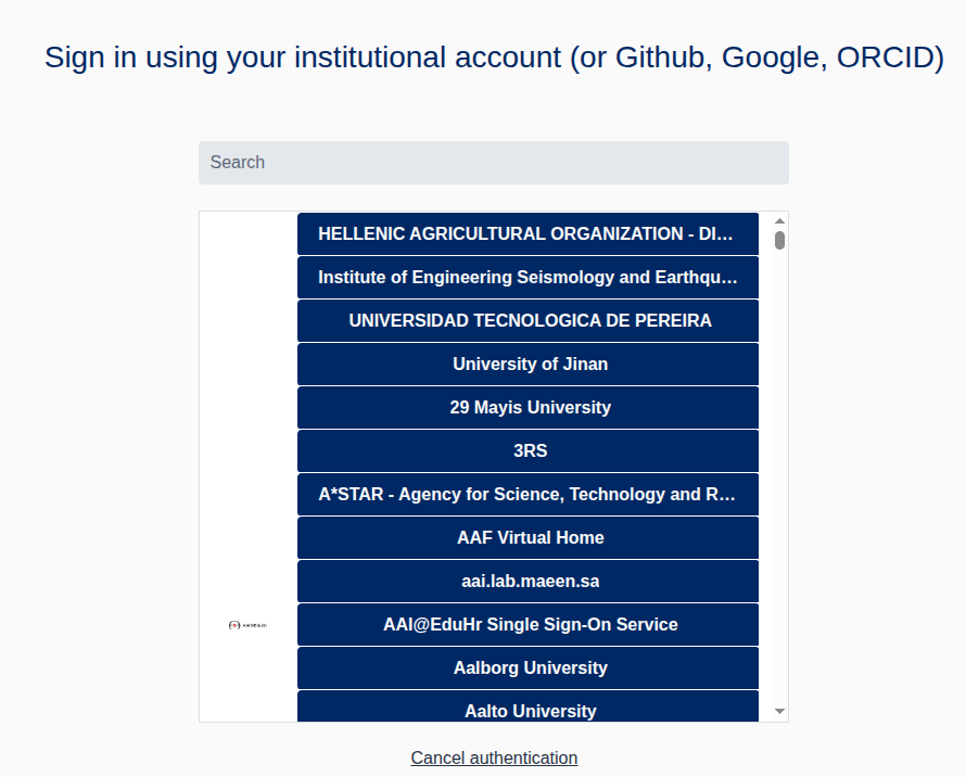3 - Search for your home institute or use on of the social Identity Provider (ORCID, GitHub or Google) and provide your credentials